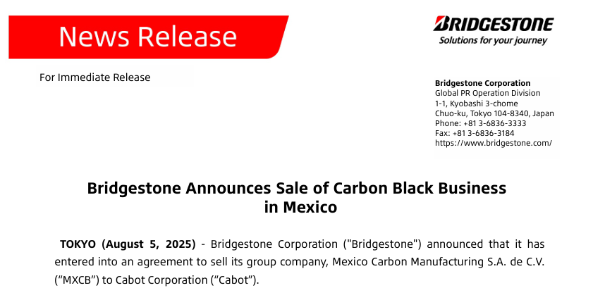 【炭黑產(chǎn)業(yè)網(wǎng)】8 月 5 日消息,繼7月7日,普利司通將位于泰國羅勇的普利司通炭黑(泰國)有限公司(BSCB)出售給東海碳素集團的泰國子公司后,普利司通株式會社于 8 月 5 日對外宣布,已和卡博特公司達成協(xié)議,將其旗下全資子公司墨西哥炭黑制造有限公司(MXCB)予以出售。