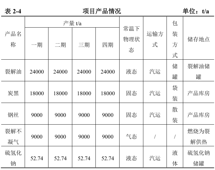 本項目建設4條生產線,共分為四期建設,其中一階段為一期1年,二期1年;第二階段三期、四期共為2年,每條線年處理廢舊輪胎6萬噸,年處理24萬噸。
