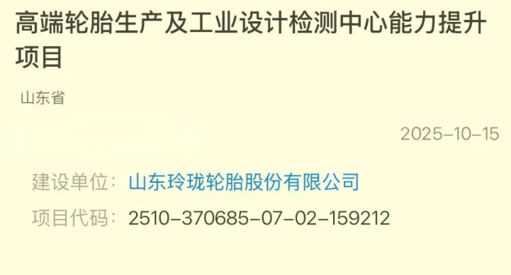 【炭黑產(chǎn)業(yè)網(wǎng)】10月18日消息,國內(nèi)輪胎行業(yè)龍頭山東玲瓏輪胎股份有限公司于10月15日完成一項重要投資項目備案,該動態(tài)迅速引發(fā)資本市場及行業(yè)內(nèi)的廣泛關(guān)注。此次備案的"高端輪胎生產(chǎn)及工業(yè)設(shè)計檢測中心能力提升項目"由公司董事長王鋒親自出任項目法人,這一安排凸顯出玲瓏輪胎在推進產(chǎn)品結(jié)構(gòu)升級與研發(fā)體系強化進程中的戰(zhàn)略決心,為企業(yè)高端化發(fā)展路徑再添關(guān)鍵注腳。