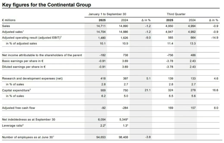 據(jù)炭黑產(chǎn)業(yè)網(wǎng)了解,2025年第三季度大陸集團(tuán)合并銷售額達(dá)到49.5億歐元(約合405.9億人民幣),較去年同期小幅下降0.9%;若剔除匯率波動及整合范圍調(diào)整的因素,公司有機(jī)銷售額同比增長2.6%。集團(tuán)調(diào)整后營業(yè)利潤為5.65億歐元(約46.33億人民幣),同比下滑14.9%,而去年同期調(diào)整后息稅前利潤因緯湃科技(Vitesco Technologies)支付的1.25億歐元一次性款項出現(xiàn)大幅增長。本季度調(diào)整后息稅前利潤率為11.4%,低于2024年第三季度的13.3%。