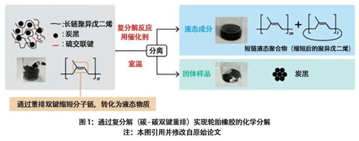 一直以來,天然橡膠類的聚異戊二烯可借助催化復分解反應實現便捷分解,但廢舊輪胎中的硫化聚異戊二烯橡膠卻因硫成分會抑制復分解反應,成為回收領域的一大難題。為此,研究團隊將突破口放在為輪胎橡膠匹配適宜的催化劑與溶劑上,以此實現交聯結構聚異戊二烯在溫和的近常溫條件下的化學分解。從工藝原理來看,分子間復分解反應會讓聚異戊二烯分子間的碳 - 碳雙鍵重排,不過生成的分子鏈長度不均,難以直接獲取短分子鏈;而分子內復分解反應則會催生環(huán)狀聚異戊二烯,進而實現分子鏈的縮短。
