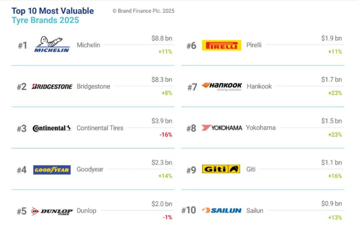 英國(guó)品牌評(píng)估機(jī)構(gòu)“品牌金融”(Brand Finance)發(fā)布“2025全球輪胎品牌價(jià)值25強(qiáng)”(Tyres 25 2025)榜單,法國(guó)米其林、日本普利司通、德國(guó)大陸馬牌蟬聯(lián)前三位,中國(guó)品牌賽輪進(jìn)入前十名。