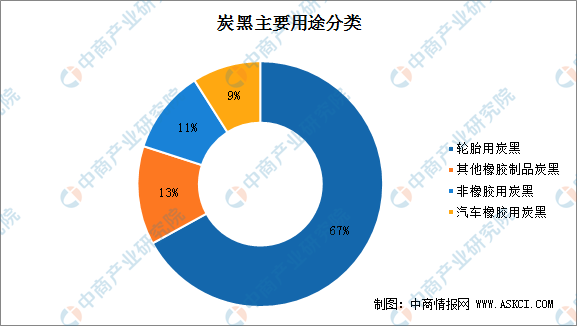 炭黑是一種重要的化工原材料,和人們的生活密切相關,被廣泛運用在多個領域。在這些用途中,用量最大的是橡膠用炭黑。橡膠用炭黑約占炭黑總量的89%,橡膠用炭黑中又以輪胎用炭黑用量最大,約占橡膠用炭黑的67%;非橡膠用炭黑約占11%,具體見下圖: