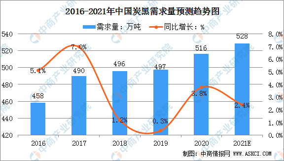 近年來,中國炭黑需求量逐年增加。2018年中國炭黑需求量為496萬噸,同比增長1.2%;2019年中國炭黑需求量為497萬噸,同比增長0.3%。2020年下半年以來,在下游需求向好推動下,炭黑市場持續回暖。中商產業研究院預計2021年炭黑需求量將進一步增加至528萬噸。