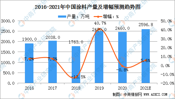 炭黑加入涂料中,其反射率小,黑度高,著色力強。炭黑的基本性能直接影響涂料的黑度、流變性和光澤等性能。2019年中國涂料產量達2480萬噸,增長40.7%,由于新冠疫情的出現,2020年涂料產量受到影響,小幅下降,預計2021年中國涂料產量將達2596.8萬噸,增長5.6%。