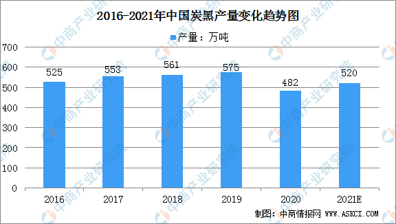 2016年以來,我國炭黑產量呈現持續增長勢頭,2019年,全國炭黑產量為575萬噸,創階段新高。2020年,因新冠疫情期間開工不足、原料緊張、需求下降等因素影響,炭黑產量減少至482萬噸,較上年同期出現較大幅度的下滑。預計2021年中國炭黑產量將達520萬噸。
