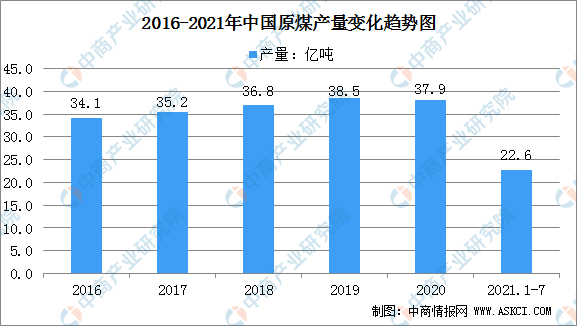 我國是全世界煤炭資源儲量最豐富的國家之一,全國煤炭查明資源儲量從1978年的5960億噸增加到2017年的1.67萬億噸,位居全球第三。全國原煤產量由2016年的34.1億噸增加到2019年的38.5億噸。2021年前7月我國原煤產量達22.6億噸,累計增長4.9%。