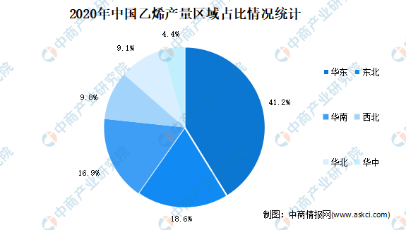 從區域占比來看,2020年華東地區乙烯產量占比達41.2%,東北地區乙烯產量占比達18.6%,前二地區占比高達59.8%。華南產量占比居中位,為16.9%。西北、華北、華中產量占比較少,分別為9.8%、9.1%、4.4%。