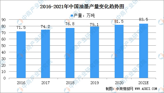 近年來,中國油墨產量增速較為平穩。油墨產量從2016年的71.5萬噸增長至2020年的81.5萬噸,年均增長率約為3.5%,中商產業研究院預計,2021年中國油墨產量將達到83.5萬噸。
