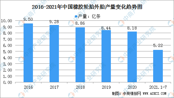 炭黑被用來制造各種類型的輪胎,如汽車輪胎、拖拉機輪胎、飛機輪胎、力車胎等。數據顯示,從2016-2020年中國橡膠輪胎外胎產量呈下降趨勢,從9.5億條下降至8.18億條。2021年1-7月全國橡膠輪胎外胎產量5.22億條,累計增長26.4%。