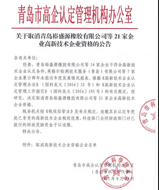 8月24日,青島市高企認(rèn)定管理機(jī)構(gòu)辦公室發(fā)布關(guān)于取消青島裕盛源橡膠有限公司等21家企業(yè)高新技術(shù)企業(yè)資格的公告。