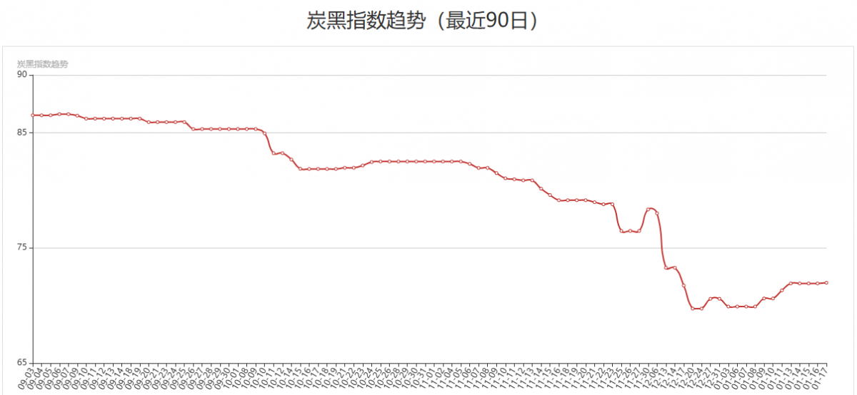 炭黑產業網根據市場N330/N220/N550三個牌號最新市場成交價格,并分別按一、二、三線品牌權重分配計算后得出今日最新炭黑指數為71.98,與之前相比炭黑指數依維持在上行區間。